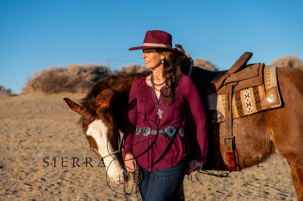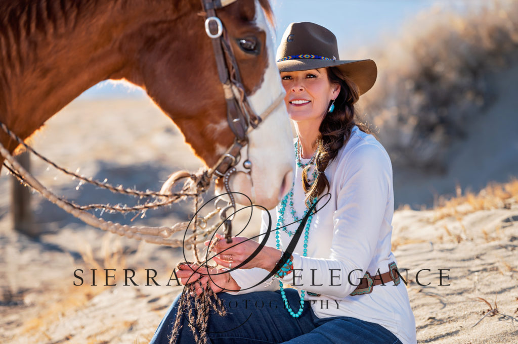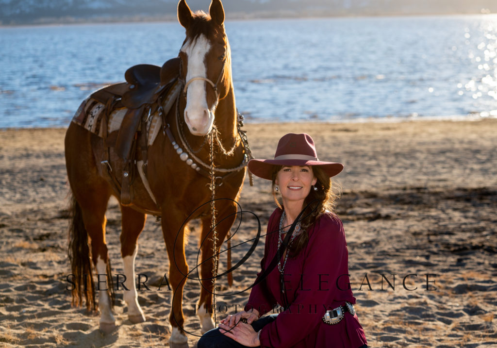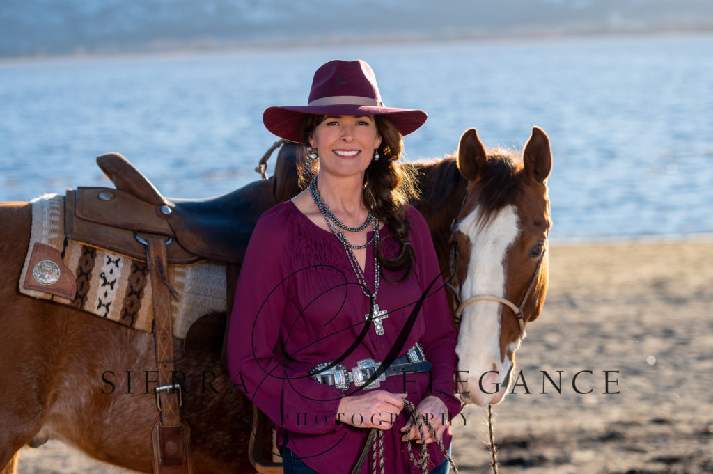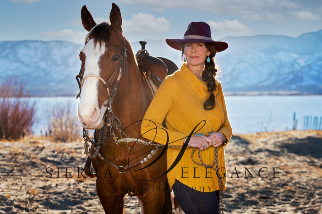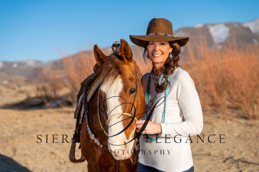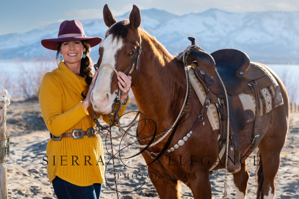 Cindy and her horse, Hal, spent a lovely sunny winter day with me at Washoe Lake. Cindy is a realtor specializing in equine and ranch properties in Northern Nevada, and really wanted to show her true self to her clients by having branding photos taken with one of her horses. Even with a little bit of a furry coat Hal looked gorgeous, as did his mom, and they posed beautifully together. Cindy chose a variety of outfits to have a great selection of photos to use with her marketing, and wanted a natural ranch look for Hal.